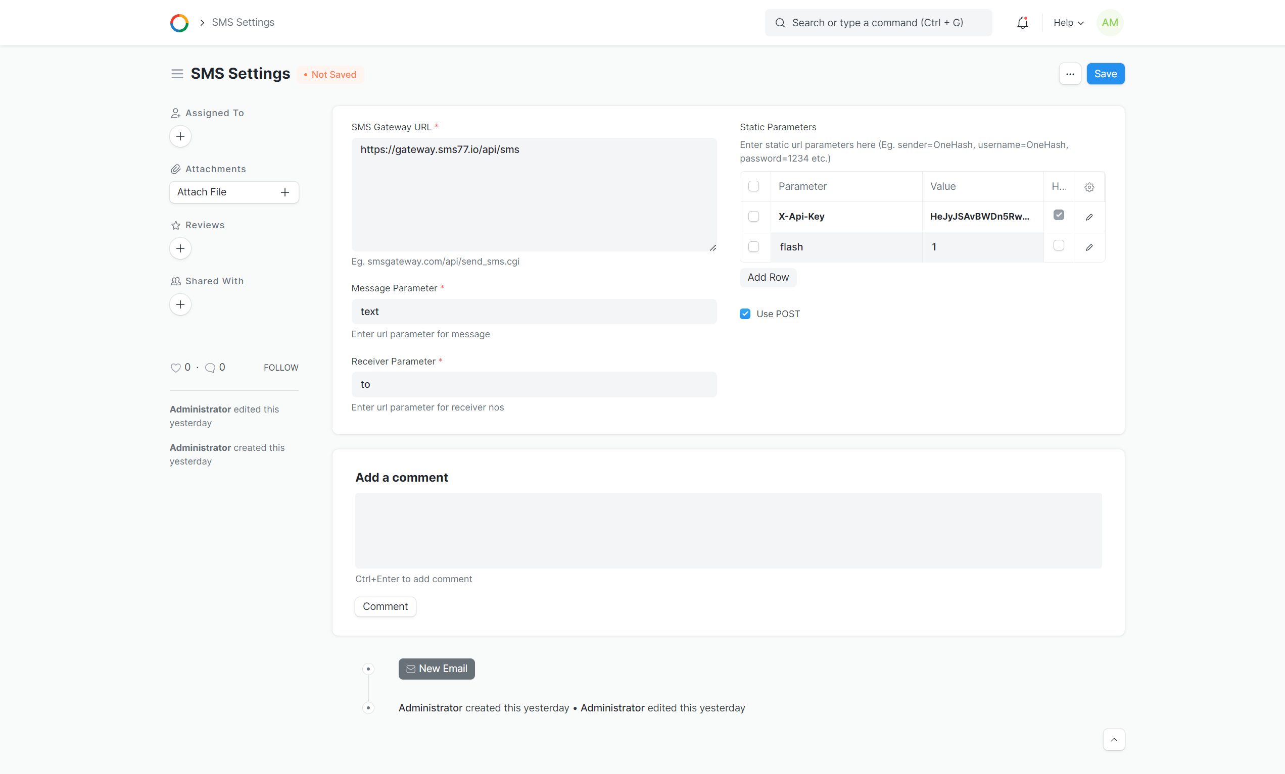 Open your dashboard and navigate to "Administration > Integrations > Settings > SMS Settings".