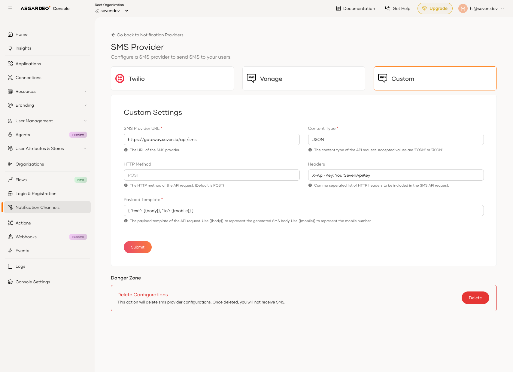 - Open the Asgardeo dashboard and navigate to Notification Channels->Custom.