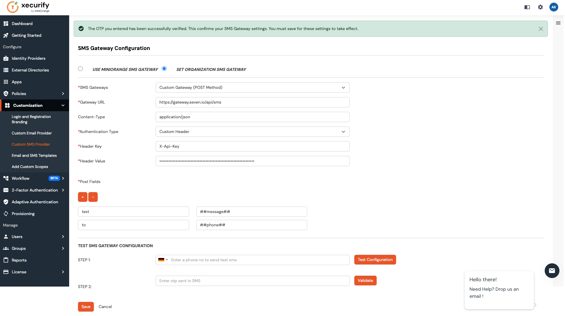 Go to Customization → Custom SMS Provider in the left navigation pane.
