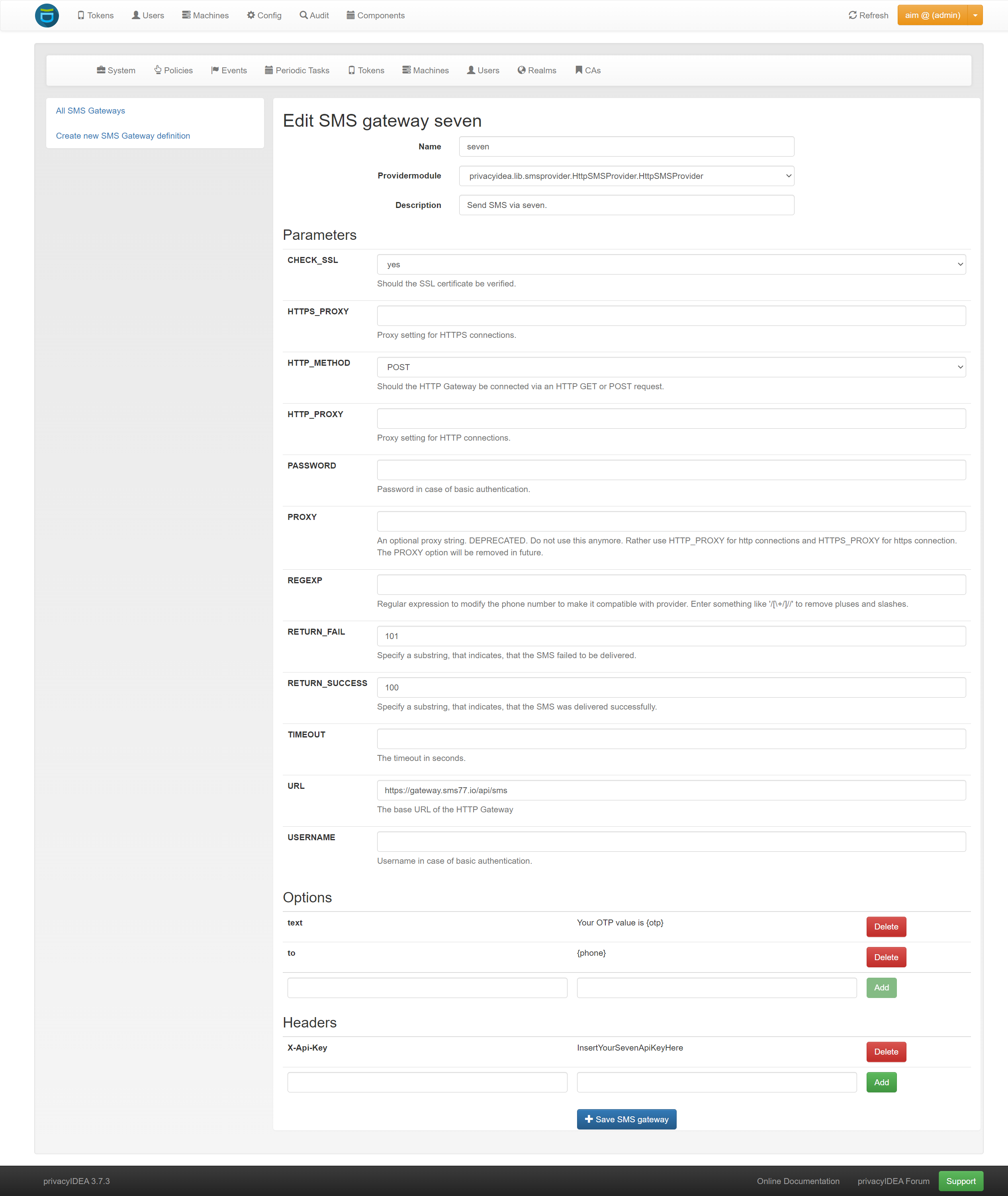 privacyIDEA is an open-source solution for identity and access management (IAM) that focuses on multi-factor authentication (MFA) to enhance security during user logins. It allows organizations to manage and enforce strong authentication mechanisms such as one-time passwords (OTP), smartcards, or biometric authentication. privacyIDEA enables administrators to configure authentication policies, manage user devices, and integrate with existing authentication systems like LDAP, Active Directory, and cloud-based applications. It supports a wide range of authentication tokens and offers flexibility in securing access to networks, systems, and data. privacyIDEA is particularly useful for companies looking to improve their security by implementing MFA and centrally managing user authentication. We explain how to set up with seven to send SMS.