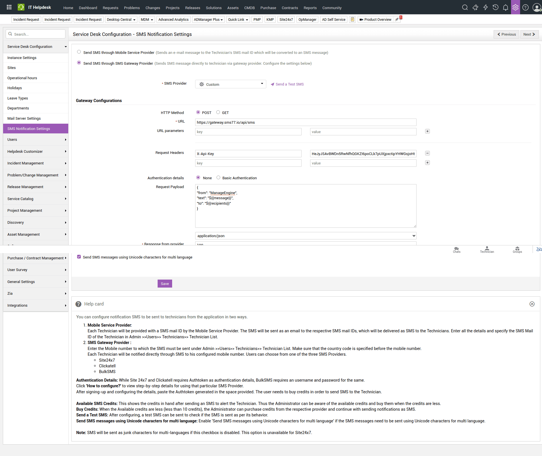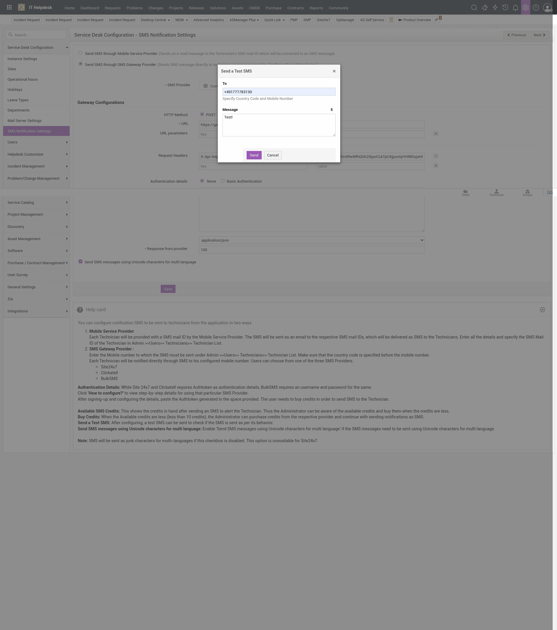 The setup is now complete and the service is used as an SMS gateway in ServiceDesk Plus.