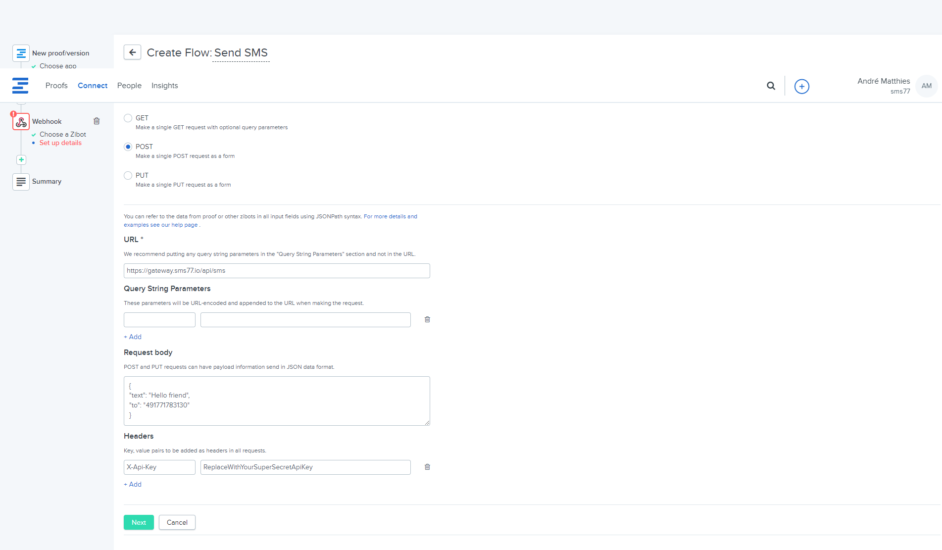 seven is not directly integrated into Ziflow, but sending SMS is still easy with the integrated "Webhook Builder" action. The setup is uncomplicated and only takes a few minutes.